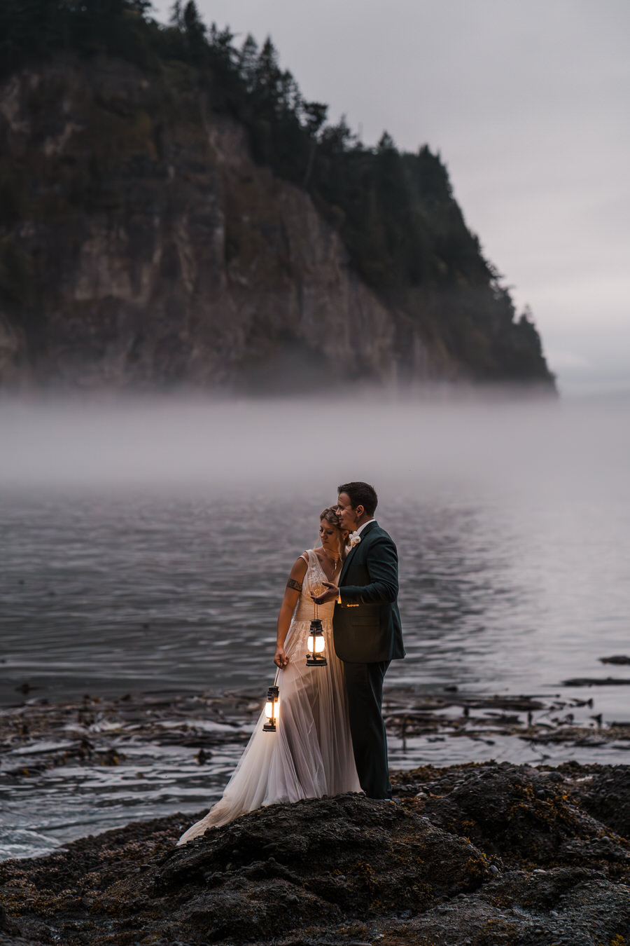 As the evening wound down, we stepped back out onto the beach for one last stretch of photos. The fog rolled in just enough to soften everything, giving the coastline that moody, almost cinematic feel. I provided them with lanterns, and as the light faded, it turned into this quiet, glowing moment against the darkening shore. No big production. Just a simple walk along the beach, wrapped in fog, ocean air, and golden light. It was the perfect way to end the day!
